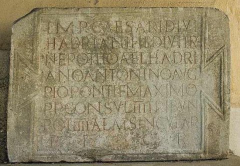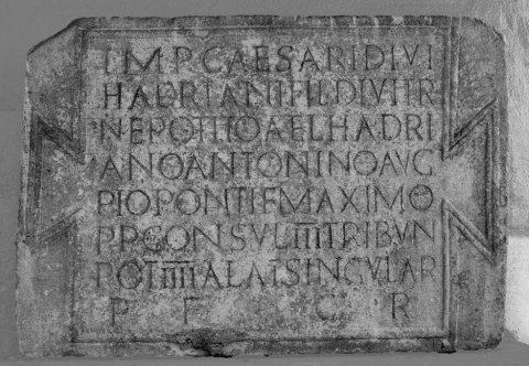 - Imp(eratori) Caesari divi / Hadriani fil(io) divi Tr(aiani) / nepo(ti) Tito Ael(io) Hadri/ano Antonino Aug(usto) / Pio pontif(ici) maximo / p(atri) p(atriae) consul(i) III tribun(icia) / pot(estate) IIII ala I singular(ium) / p(ia) f(idelis) c(ivium) R(omanorum)