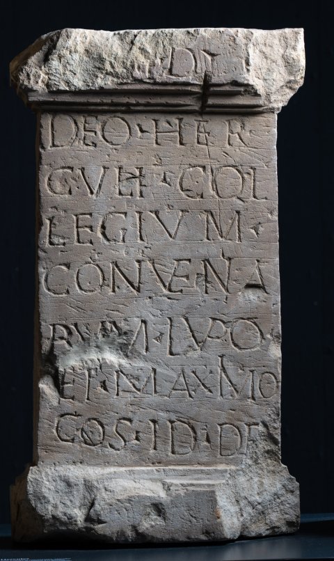 - [In] h(onorem) d(omus) d(ivinae) / deo Her/culi col/legium / convena/rum Lupo / et Maximo / co(n)s(ulibus) Id(ibus) De[c](embribus)