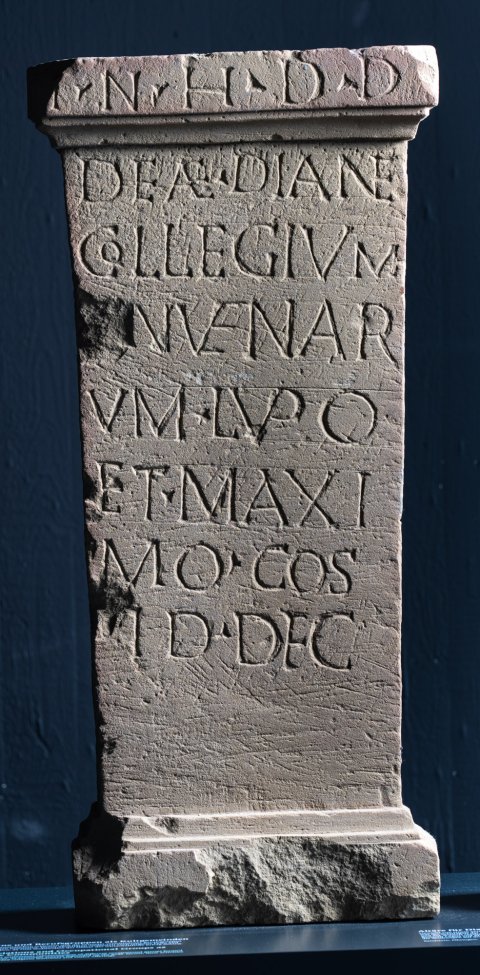 - In h(onorem) d(omus) d(ivinae) / deae Dian(a)e / collegium / [co]nvenar/um Lupo / et Maxi/mo co(n)s(ulibus) / Id(ibus) Dec(embribus)
