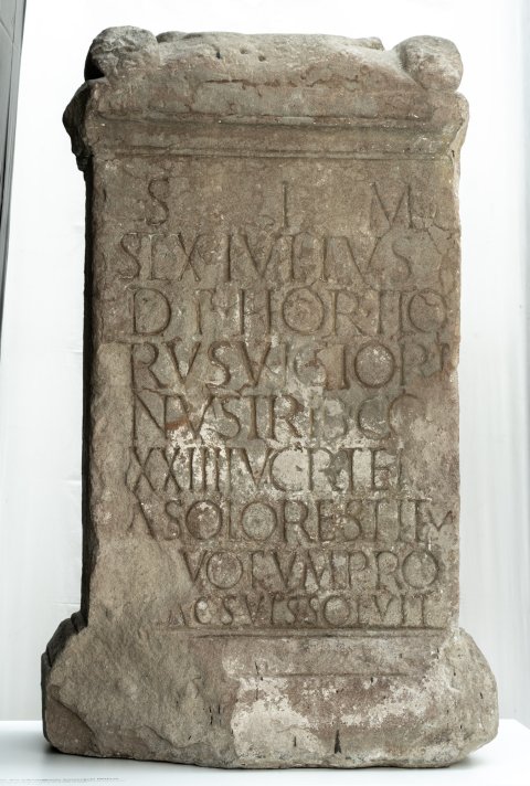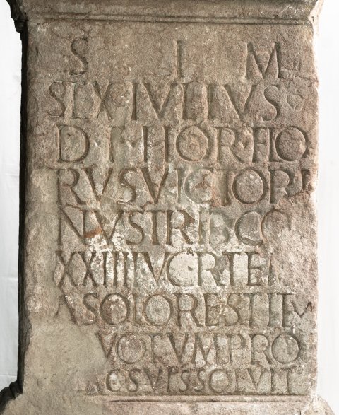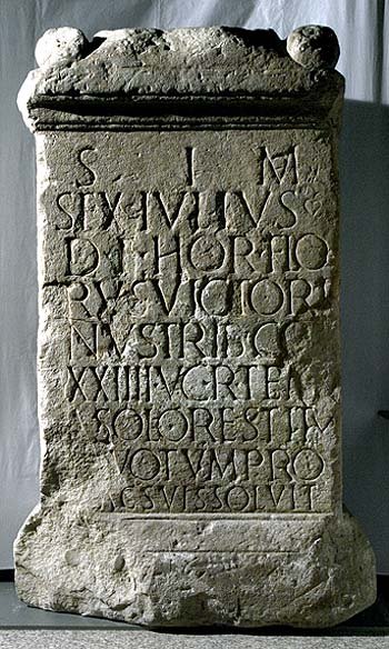 - S(oli) I(nvicto) M(ithrae) / Sex(tus) Iulius / D(ecimi) f(ilius) Hor(atia) Flo/rus Victori/nus trib(unus) co[h(ortis)] / XXIIII V(oluntariorum) c(ivium) R(omanorum) tem[p(lo)] / a solo restitu/to votum pro / se ac suis solvit