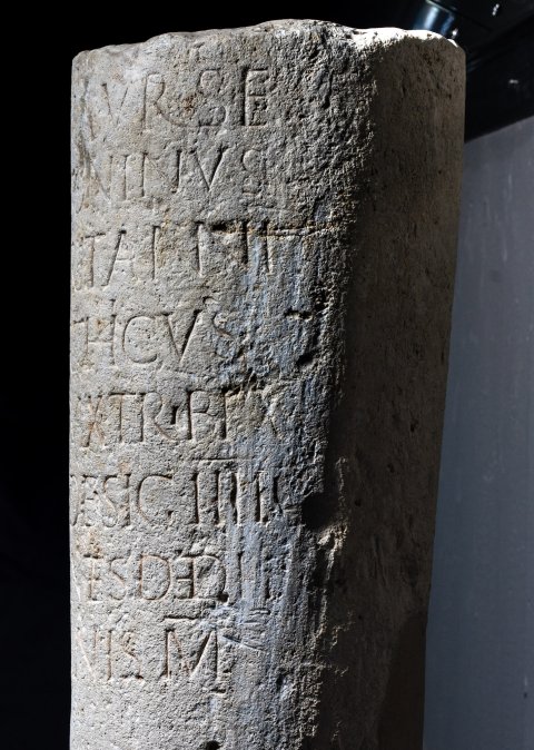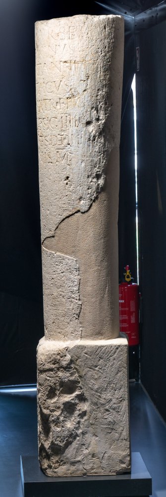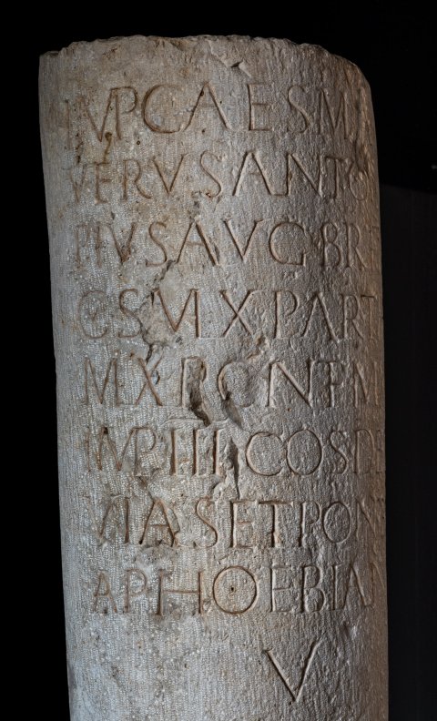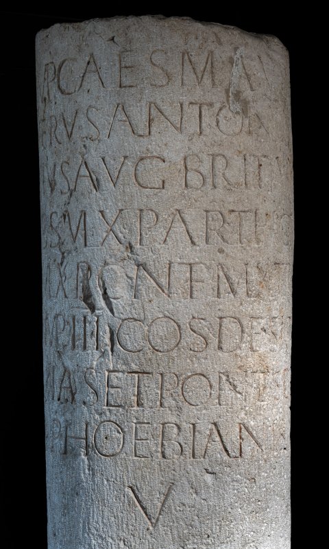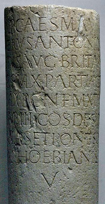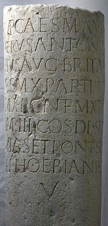 - Imp(erator) Caes(ar) M(arcus) Aur(elius) / Severus Antoninus / Pius Aug(ustus) Britanni/cus max(imus) Parthicus / pont(i)fex max(imus) / trib(unicia) p(otestate) X[V] / imp(erator) III co(n)s(ul) des(ignatus) IIII / vias et pontes dedit / a Phoebianis m(ilia) p(assuum) / V