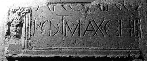 - Im linken Seitenfeld Relief: Kopf mit Locken (Gorgoneion ?).