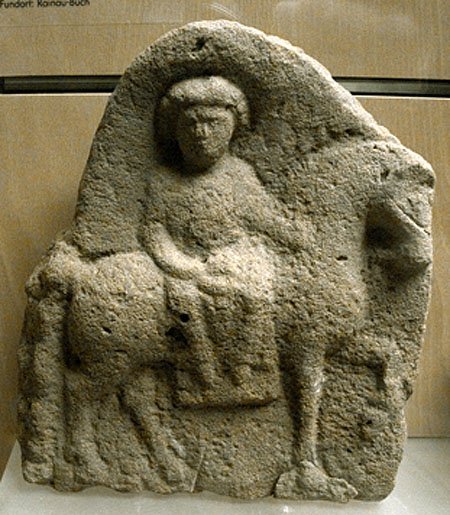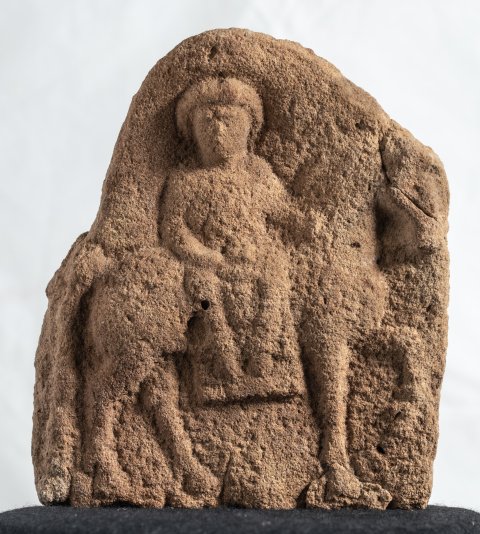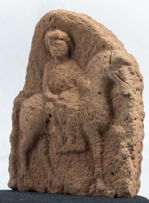 - Mythische Figur : auf einem nach rechts gehenden Pferd mit Satteldecke frontal sitzende Epona. Relief ungerahmt.