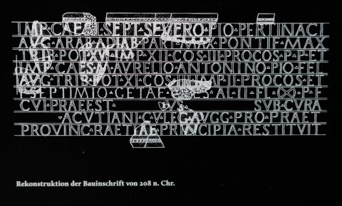 - [I]mp(eratori) [C]aes(ari) [L(ucio)] Sept(imio) Severo P[io Pe]rt[inaci] / [A]ug(usto) [Ar]ab(ico) Adiab(enico) P[ar]t(hico) max(imo) [pontif(ici) max(imo)] / [t]rib(unicia) [po]t(estate) XVI im[p(eratori) XII co(n)s(uli) III proco(n)s(uli) p(atri) p(atriae) et] / imp(eratori) [Cae]s(ari) M(arco) [Aurelio Antonino] Pio Fel(ici)] / Au[g(usto) tri]b(unicia) p[ot(estate) XI co(n)s(uli)] III imp[(eratori) II proco(n)s(uli) et] / [[P(ublio) S[eptimio Getae] Caes(ari)]] [al(a) II Fl(avia) M(milliaria) p(ia) f(idelis)] / [cui praeest ---]ius [--- sub cura] / [--- Acutiani] c(larissimi) [v(iri) le]g(ati) Au[gg(ustorum) pro praet(ore)] / [provinciae Raet]iae [pr]in[cipia restituit]