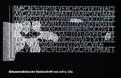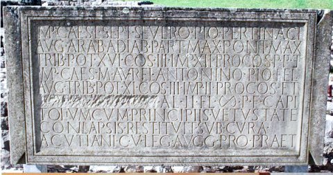 - [Imp(eratori) Caes(ari) L(ucio) Sept(imio) Severo Pio Pertinaci] / [Aug(usto) Arab(ico) Adiab(enico) Part(hico) max(imo) pont(ifici) max(imo)] / [trib(unicia) pot(estate) XVI co(n)s(uli) III i]mp(eratori) XII [proco(n)s(uli) p(atri) p(atriae) et] / imp(eratori) Caes(ari) M(arco) [Aurelio Ant]on[ino Pio Fel(ici)] / Aug(usto) trib(unicia) p[ot(estate) XI co(n)s(uli) III imp(eratori) II proco(n)s(uli) et] / [[P(ublio) S[e]pt(imio) [Get]ae Cae[s(ari)]]] al(a) II Fl(avia) M(milliaria) p(ia) f(idelis) C]ap[i]/tol[i]um cum pri[ncipiis vetust]at[e] / conlap[sis restituit sub cura ---] / A[cu]tian[i c(larissimi) v(iri) leg(ati) Augg(ustorum) pro praet(ore)]