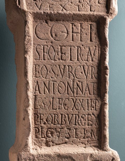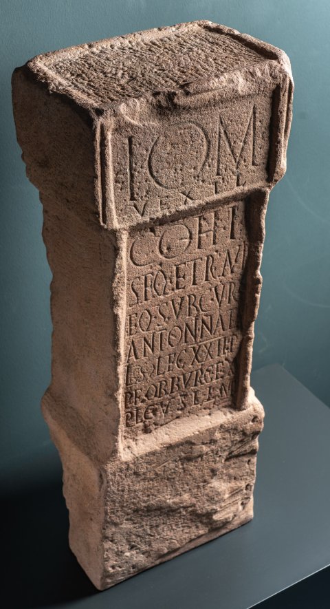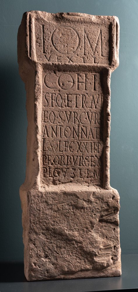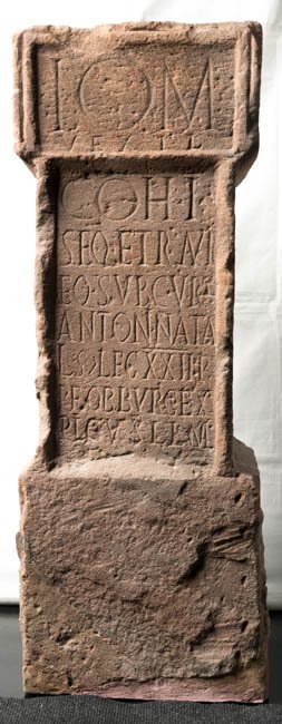 - I(ovi) O(ptimo) M(aximo) / vexil(latio) // coh(ortis) I / Seq(uanorum) et Raur(icorum) / eq(uitatae) sub cur(a) / Antoni Nata/lis |(centurionis) leg(ionis) XXII P(rimigeniae) / P(iae) F(idelis) ob burg(um) ex/plic(itum) v(otum) s(olvit) l(ibens) l(aeta) m(erito)