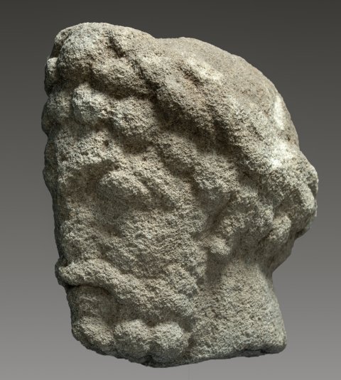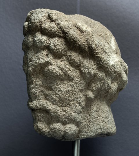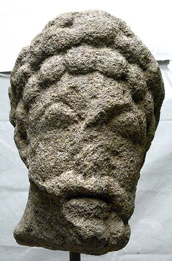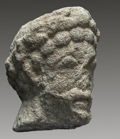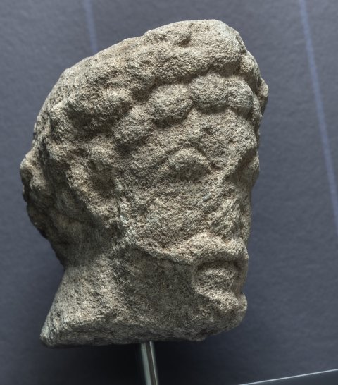 - Kaiserporträt : etwa lebensgroßer Kopf eines bärtigen Mannes mit Lorbeerkranz (Marc Aurel oder Commodus ?)