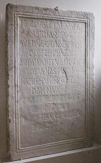 - In Chr(ist)i n(o)m(en?) // Hic sub ista labide(!) / marmorea / quem Vector (=Victor) ver (=vir) in/luster pr(a)eses / ordinabit venire / de Venostes / hic requiescit / dom(i)nus / [[Vector]] ep(iscopus) / [[------]] / [[------]] / [[------]]