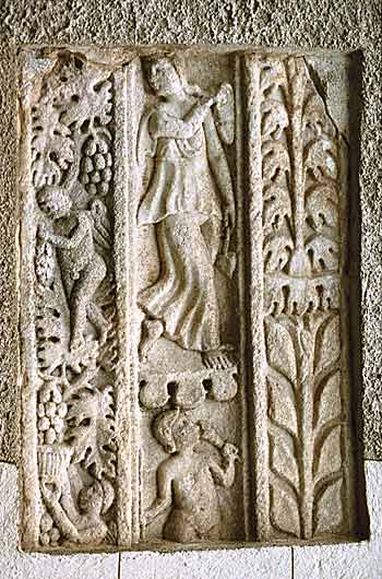 - Auf der vertikal in drei Reliefstreifen geteilten Außenseite mythische Figur: links Genien bei der Weinernte, rechts stilisierte Pflanzen. In der Mitte oben laufende Mänade: langes gegürtetes Gewand, in der Linken Blatt (Fächer ?), in der erhobenen Rechten Gefäß. Darunter Satyr, in der Rechten Becher, die Linke führt ein Rhyton zum Mund.