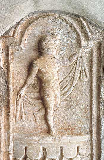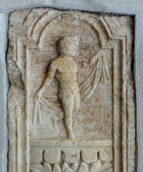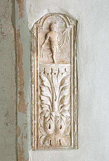 - Mythische Figur (Satyr ?): in schmalem Feld mit Bogenrahmen Blattkelch mit schirmförmigem Abschluß, darauf tanzender nackter Jüngling, der mit ausgebreitenen Armen seinen Mantel hält.