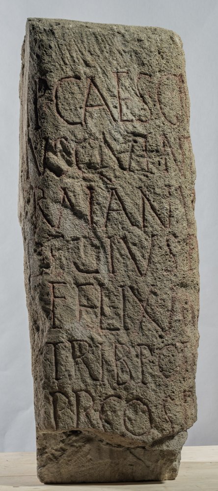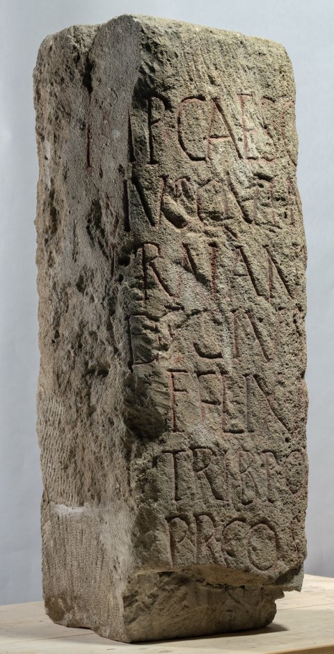- Imp(erator) Caes(ar) C(aius) Mes/sius Quintus / Traianus / Decius Pius / Felix Aug(ustus) p(ontifex) m(aximus) / trib(unicia) pot(estate) co(n)s(ul) p(ater) p(atriae) / p<r=P>(o)co(n)s(ul) pon[tes et vias conlabsas vetu]/st(ate) rest(ituit) / a K(arnunto) m(ilia) p(assuum) / XXI