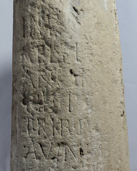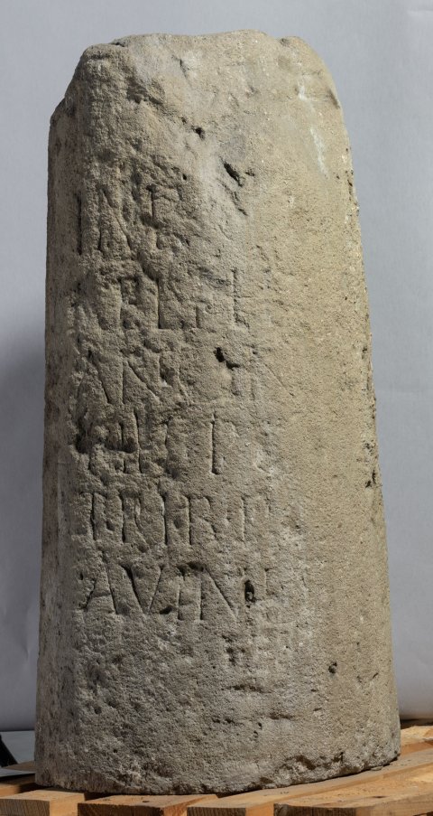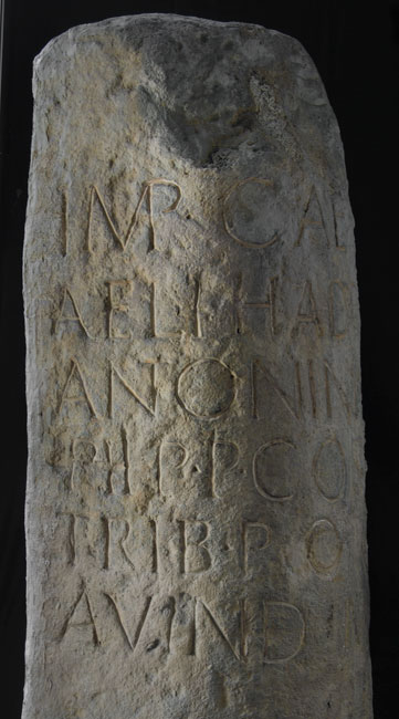 - Imp(eratoris) C[aes(aris)] Titi / Aeli H[adria]ni / Anton[ini A]ug(usti) / Pii p(atris) p(atriae) c[o(n)s(ulis)] III / trib(unicia) p[ot(estate)] VI / a Vind(obona) [m(ilia)] p(assuum) / II[[I]]