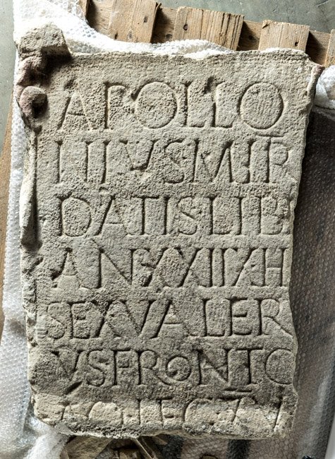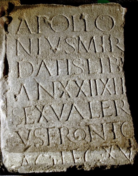 - Apollo/nius Mitr[i]/datis libe[r(tus)] / an(norum) XXIIX h(ic) [s(itus) e(st)] / Sex(tus) Valer[i]/us Fronto / aq(uilifer) leg(ionis) XV [Ap(ollinaris)] / [---