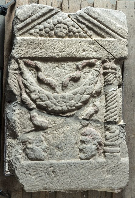 Im Hauptbild Girlande mit Tänien zwischen Säulen mit Spiralkanneluren, unten zwei Köpfe (Windgötter). - Inschrift