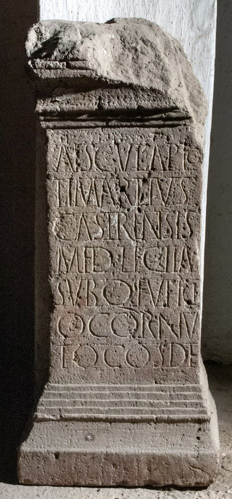 - Aesculapio / Ti(berius) Martius / Castrensis / med(icus) leg(ionis) II a(diutricis) / sub Q(uinto) Fufici/o Cornu/to co(n)s(ule) de(signato)