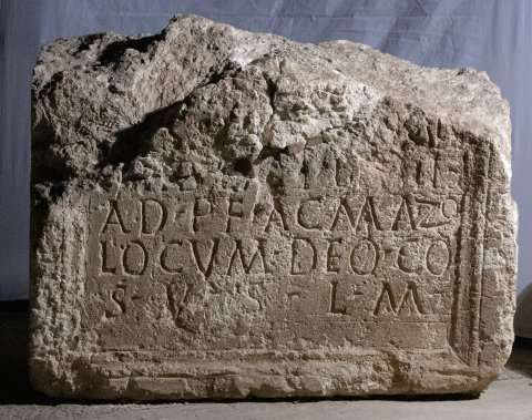 - [D(eo)] S(oli) [I(nvicto) M(ithrae)] / Cass[ius P(ius)(?) Marcelli]nus? / trib(unus) lati(clavius) leg(ionis) II / Ad(iutricis) p(iae) f(idelis) (et) Acmazo(n) / locum deo co(n)/s(tituerunt) v(otum) s(olverunt) l(ibentes) m(erito)