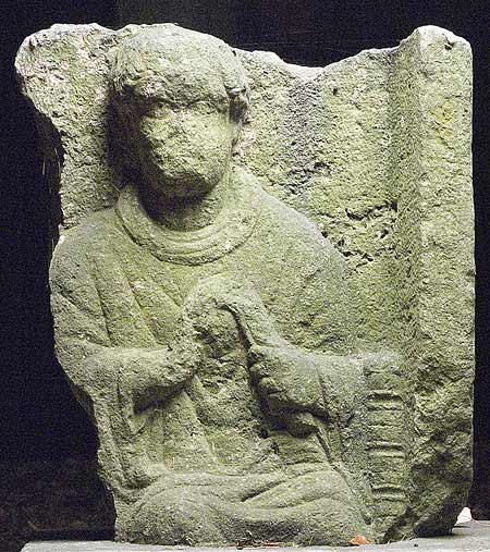 - Am rechten Bildrand sitzender Mann: bartlos (?), Halstuch, Paenula, in der Linken Rolle (volumen ?) (Peitsche ?). Rechts gedrechselte Armlehne des Sessels.