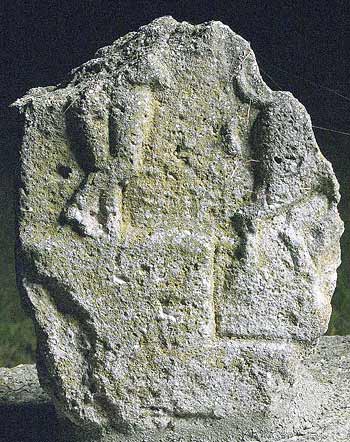- Mythos (Mithras) ?: Am linken Reliefrand stehende Figur mit gekreuzten Beinen (Cautes ?), rechts anschließend Bildfeld mit geritztem Rahmen, darin Rest eines nach rechts gehenden Stiers.