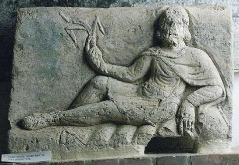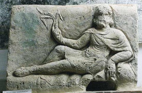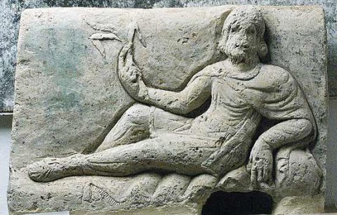 - Mythische Figur: nach rechts hin auf einer Decke mit Fransen gelagerter bärtiger Mann in orientalischer Tacht mit Hosen, Mantel, Ärmelgewand mit Gürtel, in dem ein zusammengefaltetes Tuch (?) steckt. In der Rechten Schilfstängel, der linke Arm liegt auf einem bauchigen Gefäß (Wasserauslauf).