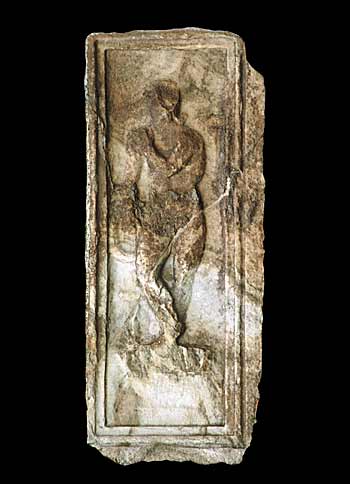 - Trauergenius: in Rechteckfeld auf Podest nackter geflügelter Knabe mit gesenkter Fackel und Kranz in der Rechten.