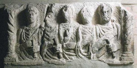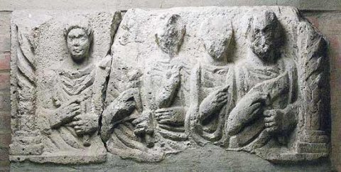 - Familie : zwischen Säulen mit Spiralkanneluren Halbfiguren von fünf Erwachsenen. Von links : Jüngling, Mann, beide im Sagum, zwei Frauen in Tunica und Mantel, bärtiger Mann in Toga contabulata, am linken Zeigefinger Ring. Die männlichen Personen halten in der Linken eine Rolle (volumen).