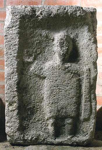 - Einfach gerahmtes Bildfeld mit stehendem Diener in kurzer Ärmeltunica, über dem linken Arm mappa, die Rechte mit Becher erhoben. Reliefspuren hinter dem Kopf und neben dem rechten Fuß (?). Linke Nebenseite geglättet.