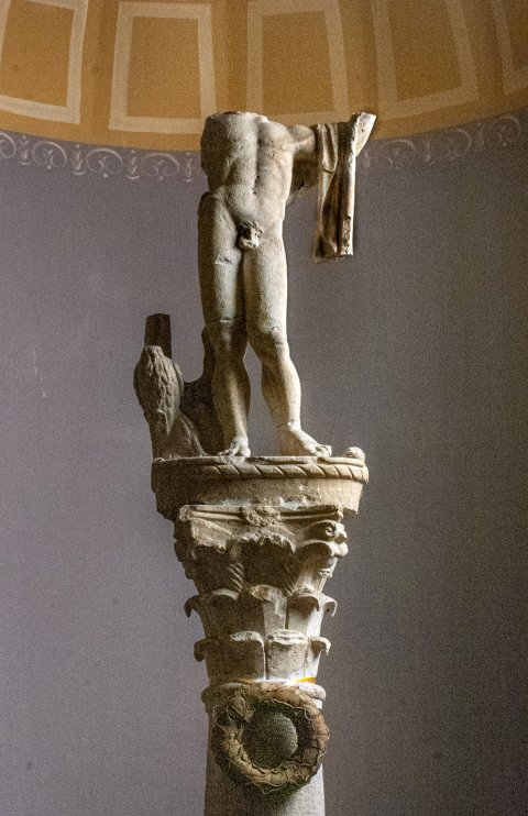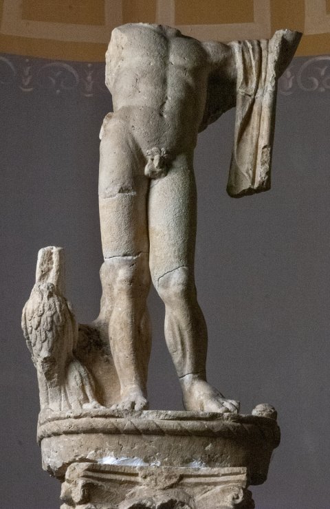 - Mythische Figur : auf einer ovalen Basis stehender nackter Jupiter, über dem erhobenem linken Arm mit Szepter Mantel, neben dem rechten Bein Adler. Säule mit korinthischem Kapitell und profilierter Basis mit Inschrift.