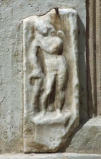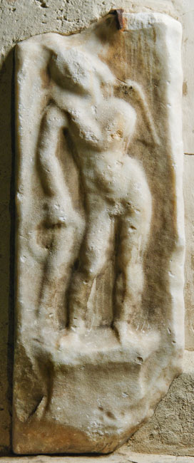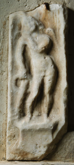 Eckblock. Auf der Vorderseite Trauergenius: auf Podest nackter geflügelter Knabe mit gesenkter Fackel und Kranz in der Rechten.