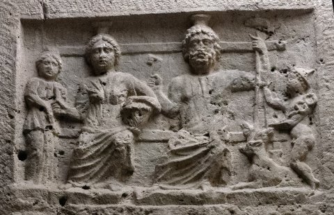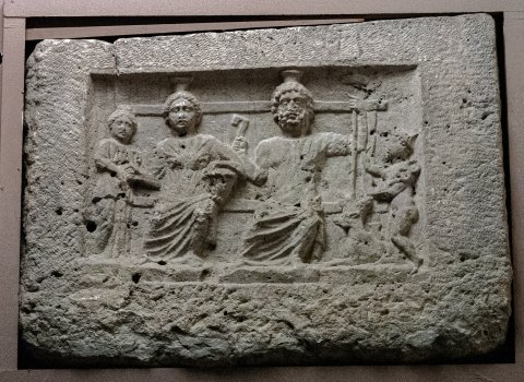 - Mythische Figur (Pluto - Proserpina oder Serapis - Isis ?): Auf einer Bank links Göttin in Chiton und Mantel, auf dem gescheitelten Haar Kalathos, den linken Arm auf einem Korb, in der Rechten Stab (Fackel ?). Links von ihr stehende Dienerin. Rechts bärtiger Gott, mit Kalathos, Chiton und Mantel, in der Linken langes Szepter, in der Rechten Schlüssel. Neben seinem linken Fuß Cerberus (Kerberos), rechts davon kleiner dargestellter stehender Mercur mit Flügelkappe und Caduceus.