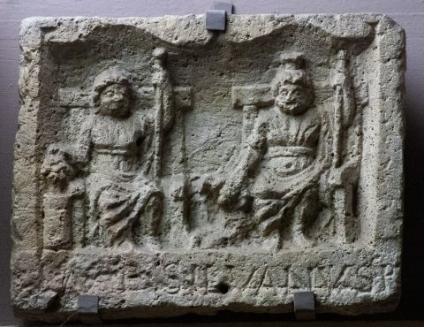 - Mythische Figuren: eingetieftes Bildfeld, oben je ein flacher Bogen über jeder Gottheit. Auf zwei nebeneinander stehenden Thronsesseln links Proserpina in Chiton und Mantel, in der Linken Szepter, die Rechte auf einem Korb mit Früchten, der auf einem Podest neben ihrem Thron steht. Rechts Pluto, bärtig, mit Kalathos, in gegürtetem Chiton und Mantel, in der Linken Szepter. Neben seinem rechten Fuß Cerberus (Kerberos). Weihinschrift auf der unteren Rahmenleiste.