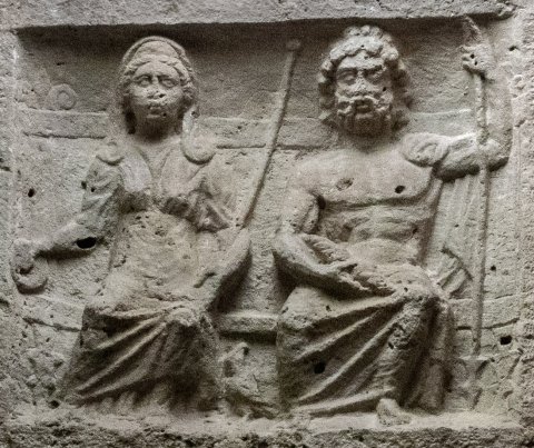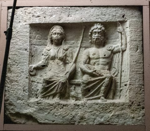 - Mythische Figuren : auf einem gemeinsamen Thron mit hoher Lehne und gedrechselten Beinen sitzt links Juno mit Diadem, Schleier, Chiton und Mantel, in der Rechten Schale, im linken Arm Szepter. Rechts Jupiter mit Kranz, Mantel über linker Schulter und um den Unterkörper, in der Rechten Blitzbündel, in der Linken Szepter. Neben seinem rechten Fuß Adler.