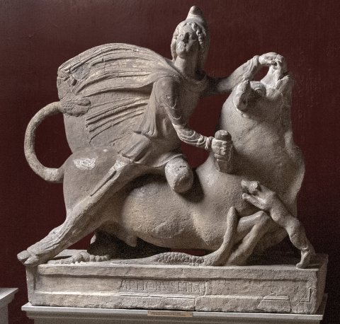- Mythos (Mithras): Stiertötungsgruppe (Tauroktonie) mit Skorpion, Schlange, Hund und Statuetten von Cautes und Cautopates mit Peltenschilden. Auf dem Sockel des Mithras Rest der Stifterinschrift.