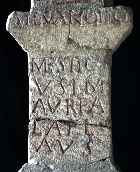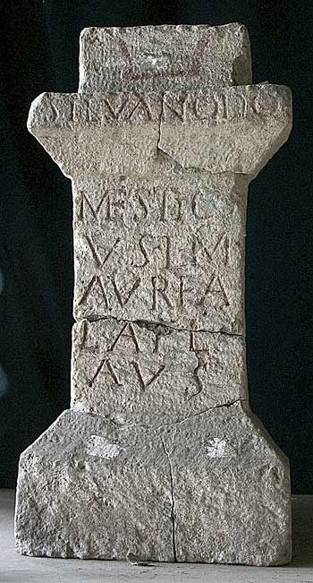 - Silvano Do//mestico / v(otum) s(olvit) l(ibens) m(erito) / Aur(elius) Fa/la(dus) Fl/a(v)us