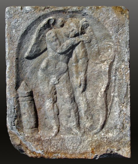 - Trauergenius (Eros): nackter geflügelter Knabe mit gesenkter Fackel, neben dem rechten Bein Köcher, am rechten Bildrand Bogen.