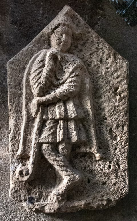 - Mythische Figur : mit gekreuzten Beinen stehender Attis mit phrygischer Mütze, Mantel, Hosen und Hirtenstab (Pedum). Ungerahmte Platte mit Giebelabschluss.
