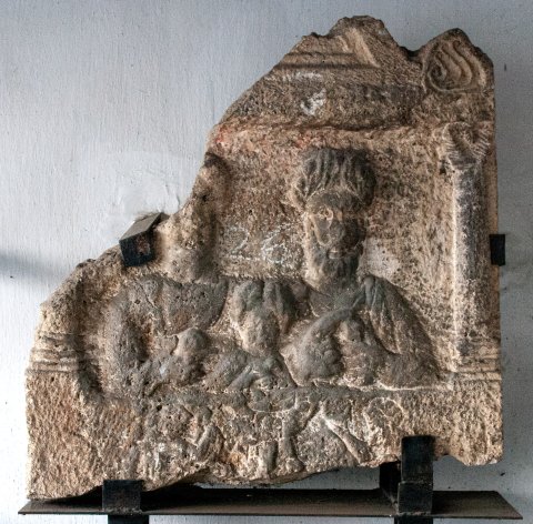 - Familie: Zwischen Säulen Brustbilder eines Ehepaares mit Kind. Links Frau mit Apfel in der Rechten, rechts bärtiger Mann mit Rolle (volumen), vorn Kind mit Vogel in den Händen. Rest eines gerahmten Giebels mit Eckakroteren mit Palmetten. Unten Zwischenbild mit Totenopfer (Tisch mit Speisen zwischen Dienerin und Diener, die jeweils ein Gefäß in die Höhe halten).