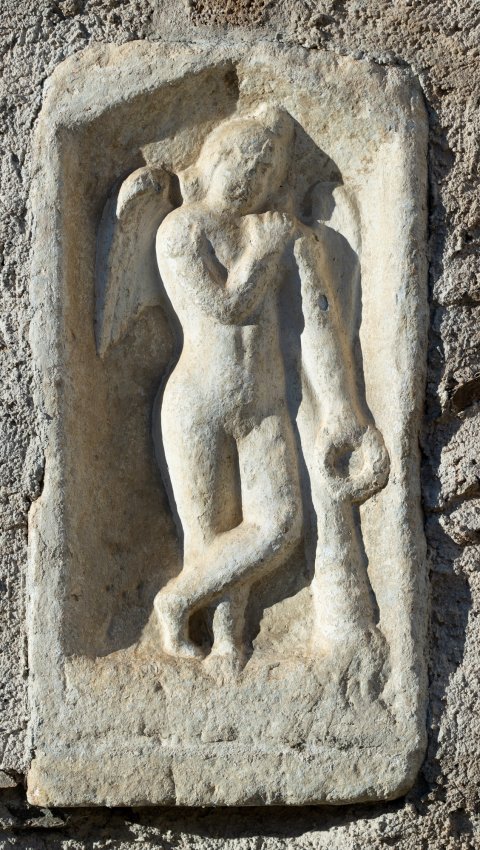 - Trauergenius: in Giebelnische nackter geflügelter Knabe mit gesenkter Fackel, in der Linken Kranz.