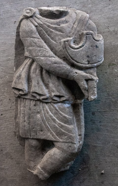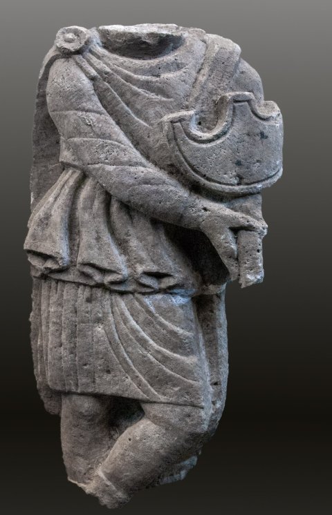 - Mythische Figur : mit gekreuzten Beinen stehender Cautopates mit phrygischer Mütze, in kurzem Ärmelgewand, Mantel und Stiefeln, hält eine gesenkte Fackel und Peltenschild. Teil eines Mithras-Kultbildes.