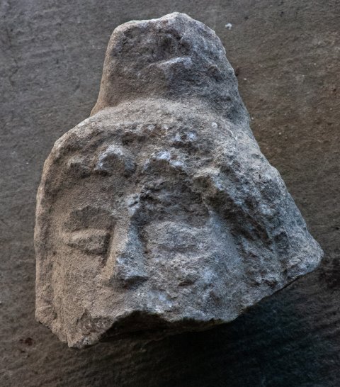 - Mythische Figur (Cautes ?): Kopf mit phrygischer Mütze und Lockenkranz um die Stirn.