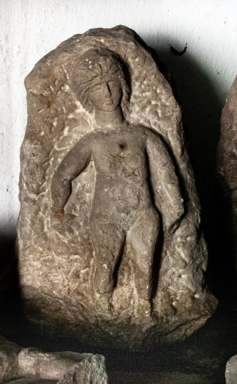 - Mythische Figur (Venus ?, Nymphe ?): Ungerahmter Block mit grob geglätteter Oberfläche. frontal stehende nackte Frau mit aufgestecktem Haar.