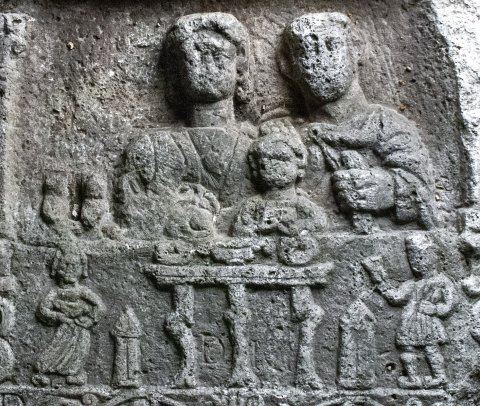 - Giebel mit Eckakroteren (Masken). Hauptbild gerahmt von Pilastern. Familie : Brustbilder eines Ehepaares mit Kind (links weitere Person ? abgemeißelt). Frau mit Mantel über beiden Schultern, Apfel in der Rechten. Mann im Sagum, Rolle (volumen) in der Linken. Vorn Kind (Mädchen). Darunter Zwischenbild mit Totenopfer zwischen Flechtbändern: links Dienerin mit Schüssel, dreibeiniger Tisch mit Speisen, rechts Diener mit Becher und mappa. seitlich des Tisches je ein zylindrischer Behälter mit konischem Deckel (Laterne ?). Schriftfeld seitlich und unten mit Efeuranken, die aus einem Krater wachsen, und oben mit Spiralranken gerahmt.