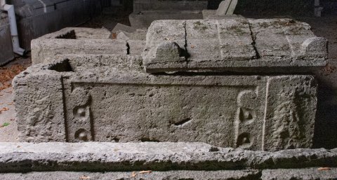 - Dachförmiger Deckel mit Akroteren. Gerahmtes Schriftfeld, seitlich sogen. Barockmotiv. Seitenfelder ungerahmt, Figuren in Bossen angelegt.