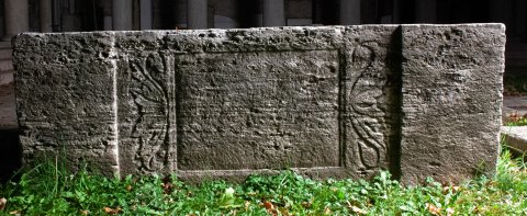 - unfertiges (bossiertes), gerahmtes Schriftfeld zwischen Akanthuskelchen