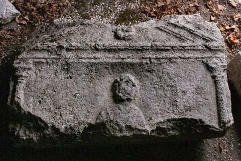 - Giebel mit profiliertem Rahmen und Rosette. Im Hauptbild Porträt einer bärtigen Mannes zwischen Säulen.