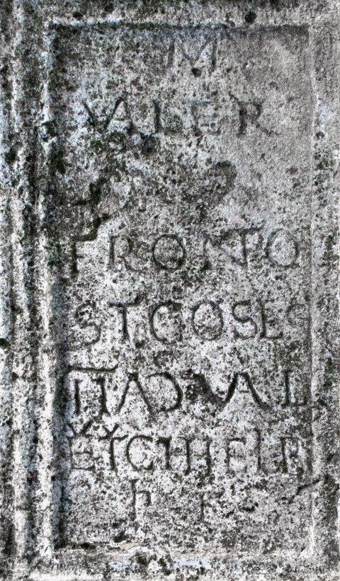 - M(arcus) / Valer(ius) / Fronto / st(rator) co(n)s(ularis) leg(ionis) / II ad(iutricis) Val(eria) / Eutychie lib(erta) / pi(entissimo) f(ecit)