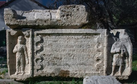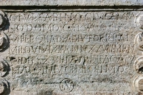 - D(is) M(anibus) // C(aio) Iul(io) Sabino civi Campa/no domo Capua q(uondam) / mil(iti) leg(ionis) II Adi(utricis) adiut(ori) off(icii) rat(ionum) / mil(itum ?) qui vixit ann(os) XXVIII men/s(em) I dies XVIII Aurelia Caria/nae (!) ciniugi (!) piissimo // o(pto) s(it) t(ibi) t(erra) l(evis)