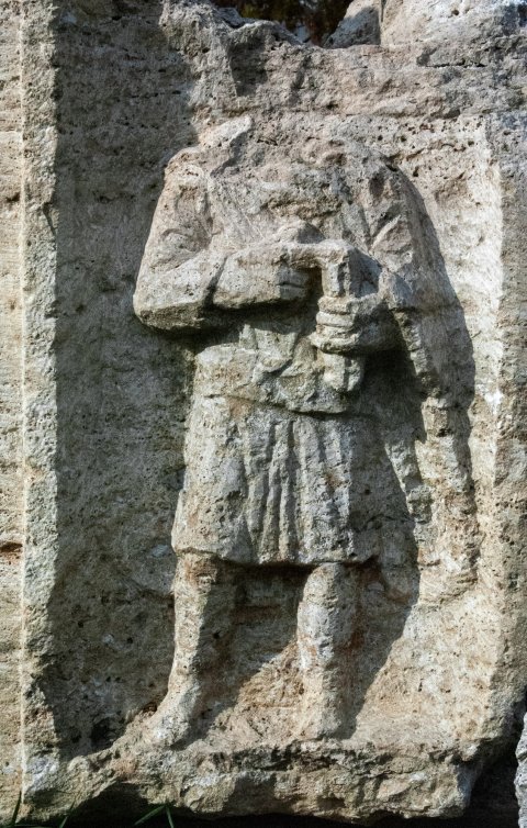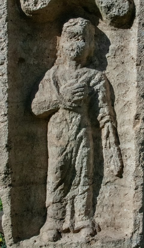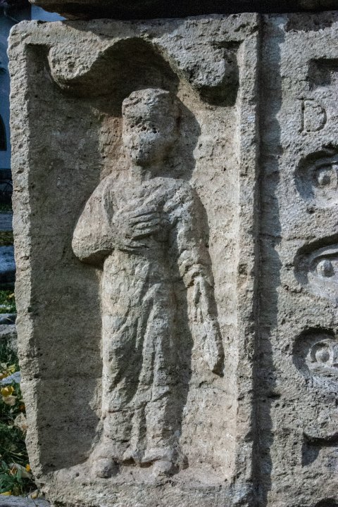 - Schriftfeld mit profiliertem Rahmen mit sogen. Barockmotiv an den Schmalseiten. Über den Seitenfeldern Bogen mit Volutenenden. Links Frau in Tunica und Mantel, rechts Mann (Soldat) in Ärmeltunica, Gürtel mit Ringschnalle (?), Sagum, in der Linken Rolle (volumen). Waffen: an der linken Hüfte Schwert.