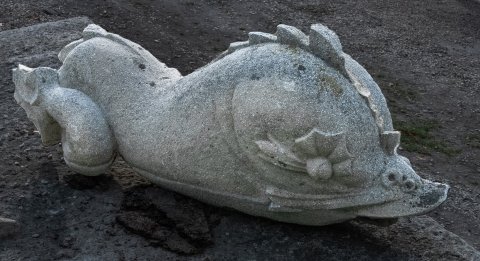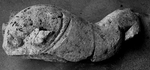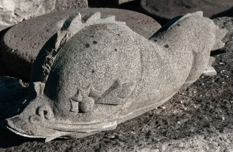 - Delphine mit ornamental gestalteten Details (Augen, Schnauze, gezackter Flossensaum auf dem Rücken). Auf der Unterseite Standfläche mit Nut. Brunnenfiguren ?