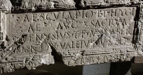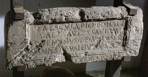 - Aesculapio et Hygi/ae Aug(ustis) sacrum / T(itus) Venusius T(iti) f(ilius) Mene(nia) Aper / [P]raene(ste) opt(io) valetudi(narii) v(otum) s(olvit) l(aetus) l(ibens) m(erito) // V Kal(endas) Octob(res) posuit