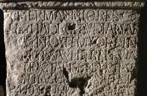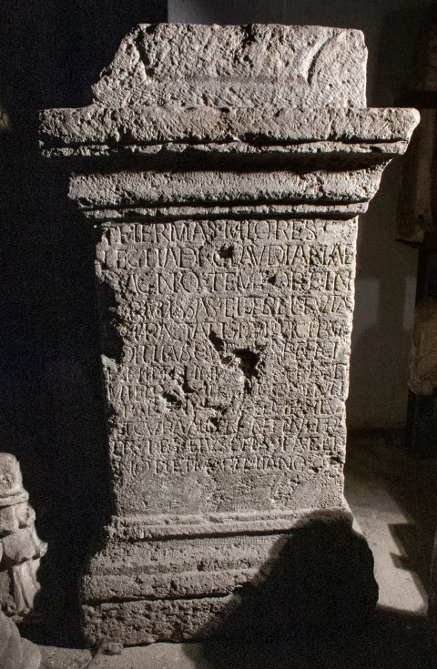 B: Thermas maiores / leg(ionis) II Adi(utricis) Claudianae / [m]agno tempore in/[te]rmissas et destitutas / [re]tractatis porticibus / [a]ditibusque [pri]us refeci[t] / exhiberi inde [inc]episse / militib(us) [iuss]it [pri]die Kal(endas) Iuli(as) / praes[ide pr(ovinciae) e(gregio)] v(iro) Clemen(tio) Silvi(no) / et cura Aur(eli) Frontini pra/ef(ecti) leg(ionis) eiusdem Pater/no II et Mariniano co(n)(ulibus). -